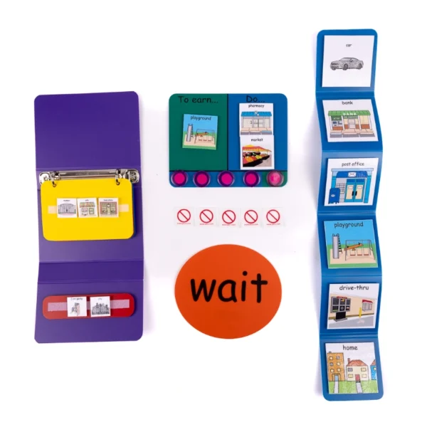 Communication happens everywhere! The Community Travel Pack is designed for on-the-go communication opportunities and needs. Perfect for keeping your learners’ critical expressive and receptive communication tools accessible during a community outing or family vacation. Traveling can bring unexpected challenges; help your learner know what to expect throughout their day, earn rewards for task completion, and calmly manage waiting or when something is unavailable in any setting. Compact in size and easy to carry, the Community Travel Pack includes 1 Mini PECS Communication Book, 1 Compact Travel Schedule Board, 1 Earn-Do Card, 1 Wait Card, and 5 Small Universal No Symbols.
