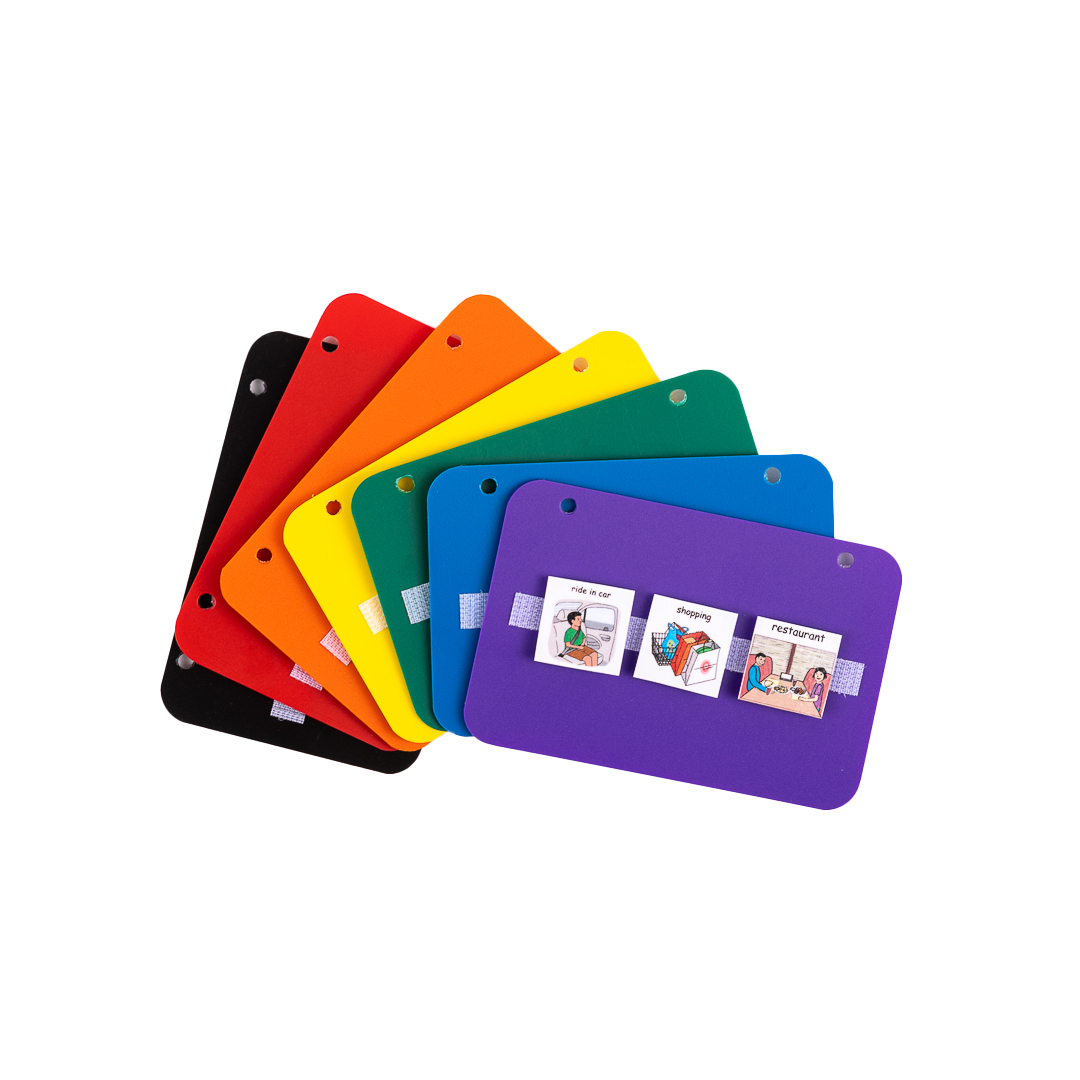 Measuring 8 1/2″ X 6 1/2″, the pages are made of a thick, poly plastic material that is smooth to the touch, yet extremely durable. The tabbed pages offer a uniquely color-coded tab for easy page turning and may be used as dividers for staying organized. Each set of six includes an assortment of colors (as shown) and strips of VELCRO® Brand hook for self assembly so you may customize to your liking. Set sold separately and may not be combined with any other page size or style. Custom pages with strips of VELCRO® Brand loop are available upon request.