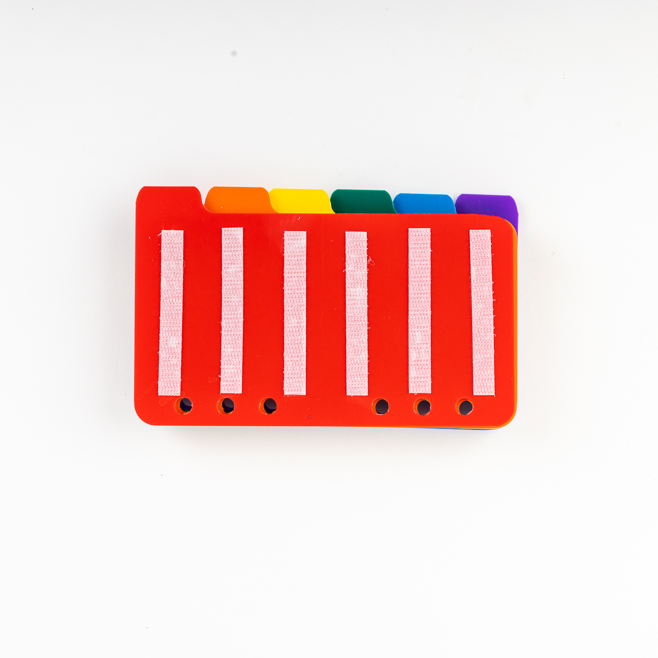 Measuring 6 3/4″ X 3 3/4″, the pages are made of a thick, poly plastic material that is smooth to the touch, yet extremely durable. The tabbed pages offer a uniquely color-coded tab for easy page turning and may be used as dividers for staying organized. Set of six includes an assortment of colors (as shown) and strips of VELCRO® Brand hook for self assembly so you may customize to your liking. Set sold separately and may not be combined with any other page size or style. Custom pages with strips of VELCRO® Brand loop are available upon request.