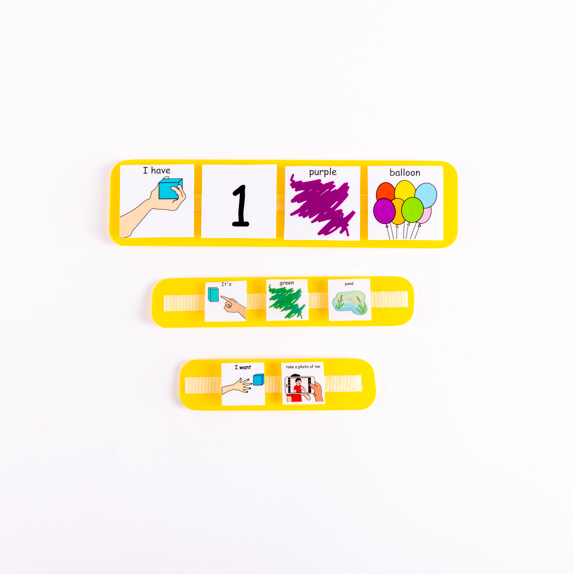 The PECS® Communication Book Sentence Strip™ is designed for learners to build and exchange a multi-picture message to either comment or request.  Its length allows users to build pictures with verbs, attributes, nouns, and more.  The Sentence Strip attaches to the bottom extension of the PECS Communication Book so that it is always visible to the learner.