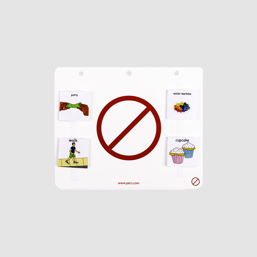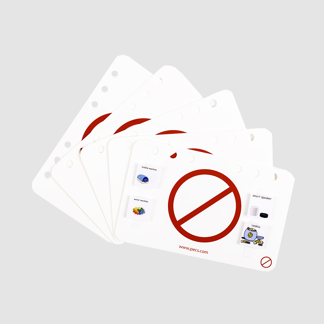 The Universal NO Page is designed as a unique page for use in our Small and Large PECS Communication Books where we move pictures of items that are unavailable. The learner can still exchange the picture but will learn that if the picture is on the NO page, the item is not available. Once the item is available again, move it back into the book where it is normally stored.